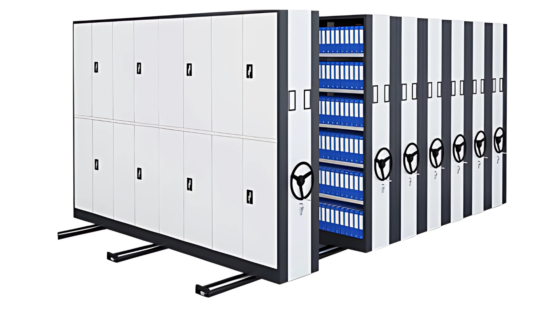 A mobile shelving system is designed for high-density storage, reducing the need for fixed aisles by incorporating movable shelves.